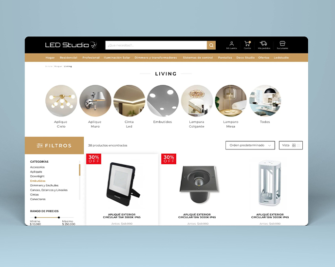 El desarrollo del sitio web e-commerce de LED STUDIO fue un proceso cuidadosamente planificado y ejecutado, enfocado en capturar la esencia de la marca y resaltar su propuesta de valor: productos de iluminación de alta calidad con un diseño elegante y moderno.